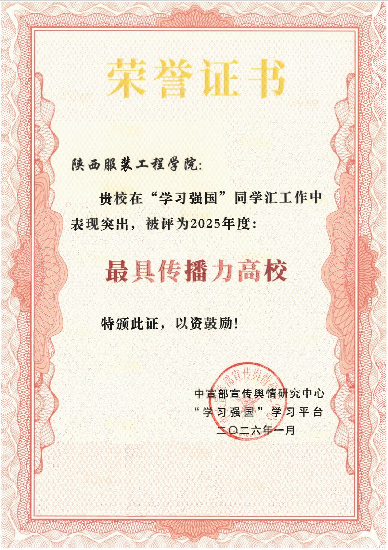 陕服新闻网讯(李文斌)近日,中宣部宣传舆情研究中心、“学习强国”学习平台正式公布2025年度“学习强国”同学汇表彰结果。我校凭借在网络思政建设与内容传播领域的卓越表现及广泛影响力,一举获得两项荣誉:学校荣获“2025年度最具传播力高校”称号,网络思政作品《影院包场“开学礼”陕西服装工程学院千名学子同看〈哪吒2〉》获评“2025年度人气作品”。此次获奖充分彰显了学校在新时代思想政治教育与校园文化网络传播工作中的创新活力与显著成效。...