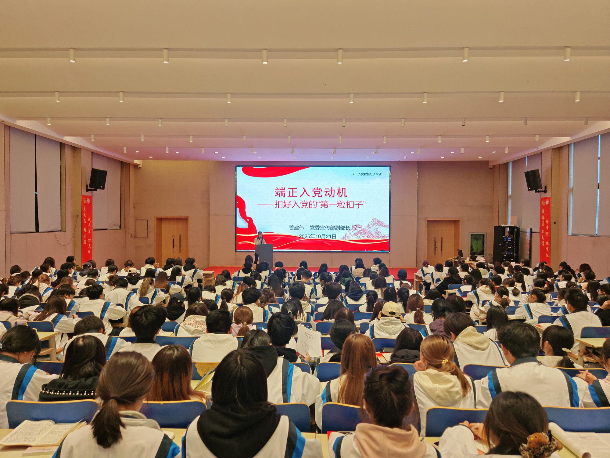 党委宣传部副部长菅建伟围绕“端正入党动机—扣好入党的第一粒扣子”,从什么是正确的入党动机,如何树立正确的入党动机,以实际行动加入中国共产党三个方面展开授课。她强调,入党动机是成为一名合格党员的第一起点,要始终秉持正确的入党动机,坚持全心全意为人民服务。要在日常工作和学习中自觉严格要求,脚踏实地,志存高远,砥砺奋进,展现出当代青年大学生的良好精神风貌。
